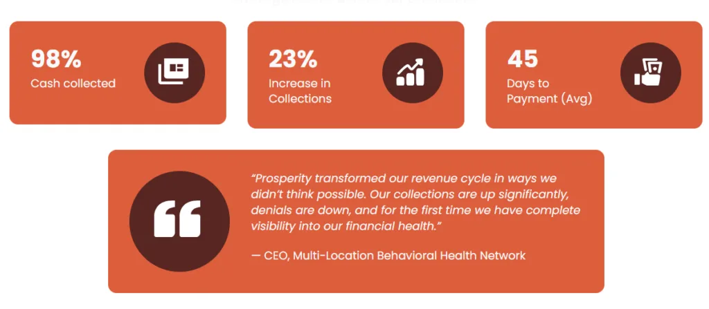 Prosperity manages revenue cycle operations for behavioral health providers ranging from single-site outpatient practices to multi-facility residential programs. Our clients consistently hit 98% cash collection rates and under 45 days to payment on commercial claims.